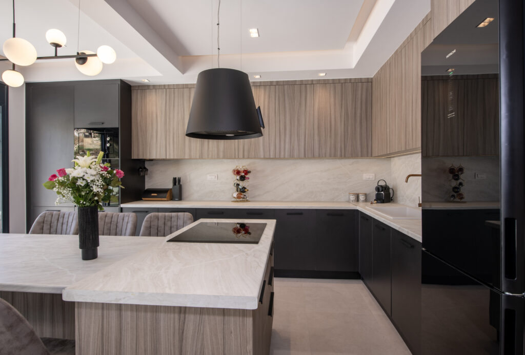 The gourmet kitchen is outfitted with modern appliances and ample workspace, ideal for creating delicious meals for family and friends during your stay.